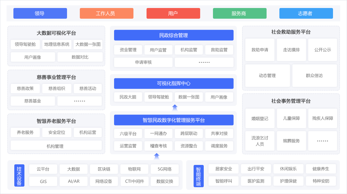 針對民政業務相對獨立,重復繁雜,信息資源無法共享等痛點,打造覆蓋民政基層“橫向到邊、縱向到底”全業務的應用平臺,全面管理社會救助、社會事務、社會組織、防返貧、慈善事業、殯葬服務、政務辦公、優撫安置等業務。根據各地不同特點定制開發,實現省、市、縣(區)、街道、社區五級貫穿,建設“業務縱橫統分、數據整合聯動、監管實時比對、領導一圖全覽“的數字民政體系。